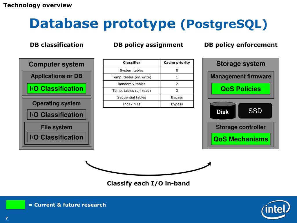 Database prototype (PostgreSQL) Technology overview Classify each I/O in-band DB classification DB policy assignment DB policy enforcement Storage system Computer system Management firmware Applications or DB QoS Policies I/O Classification Disk SSD Operating system I/O Classification Storage controller File system QoS Mechanisms I/O Classification = Current & future research