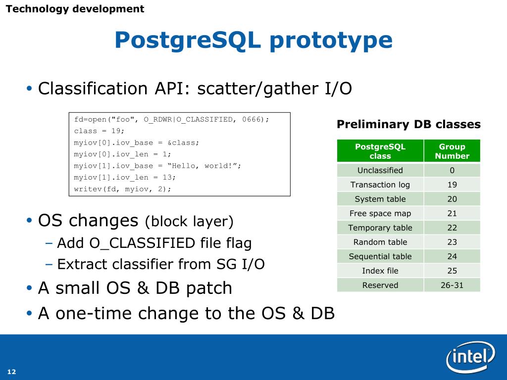 Technology development PostgreSQL prototype • Classification API: scatter/gather I/O • OS changes (block layer) • Add O_CLASSIFIED file flag • Extract classifier from SG I/O • A small OS & DB patch • A one-time change to the OS & DB fd=open("foo", O_RDWR|O_CLASSIFIED, 0666); class = 19; myiov[0].iov_base = &class; myiov[0].iov_len = 1; myiov[1].iov_base = “Hello, world!”; myiov[1].iov_len = 13; writev(fd, myiov, 2); Preliminary DB classes