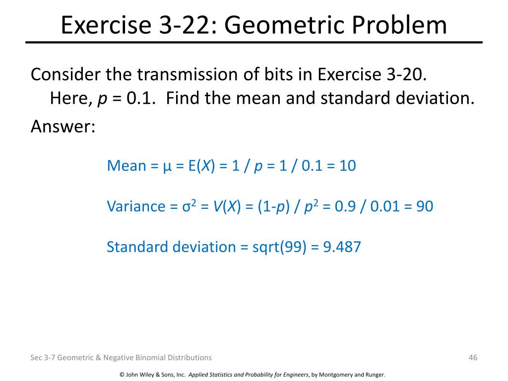 Exercise 3-22: Geometric Problem Consider the transmission of bits in Exercise 3-20. Here, p = 0.1. Find the mean and standard deviation. Answer: Mean = μ = E(X) = 1 / p = 1 / 0.1 = 10 Variance = σ2 = V(X) = (1-p) / p2 = 0.9 / 0.01 = 90 Standard deviation = sqrt(99) = 9.487 Sec 3-7 Geometric & Negative Binomial Distributions