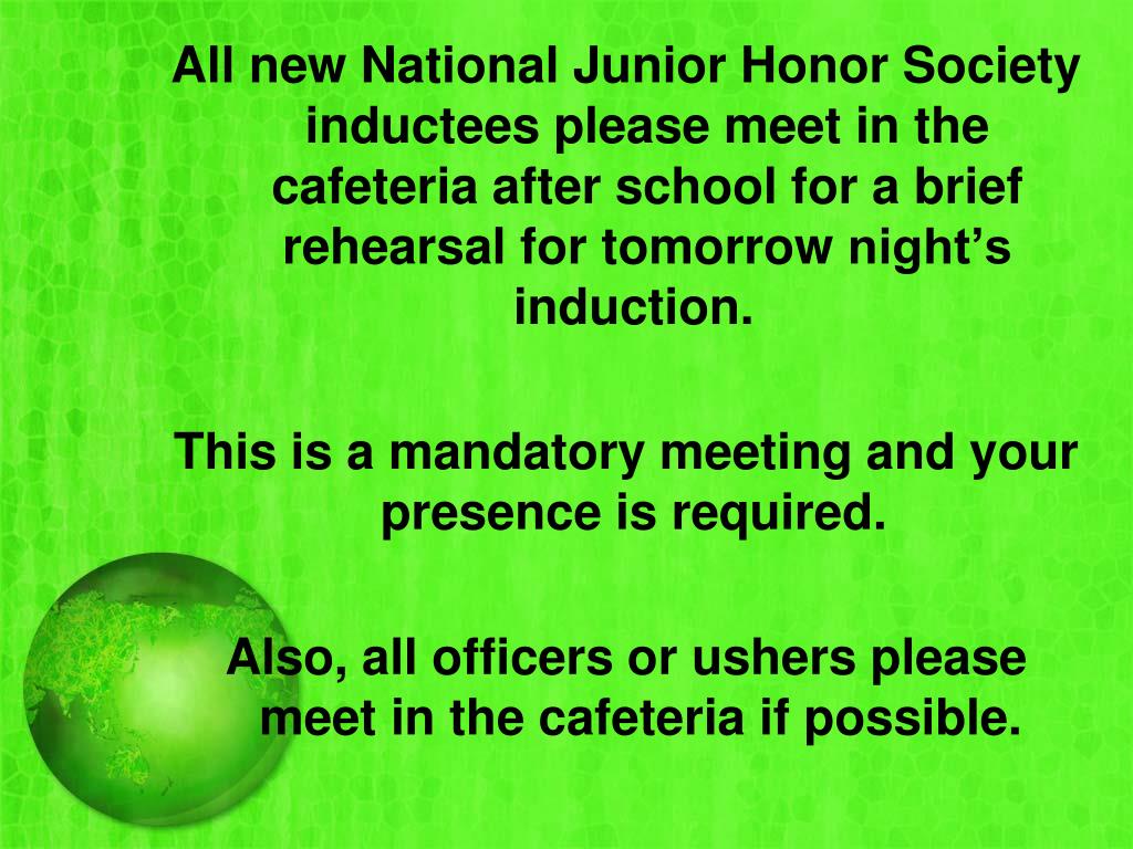 All new National Junior Honor Society inductees please meet in the cafeteria after school for a brief rehearsal for tomorrownight’s induction. This is a mandatory meeting and your presence is required. Also, all officers or ushers please meet in the cafeteria if possible.