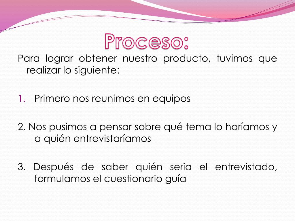 Proceso: Para lograr obtener nuestro producto, tuvimos que realizar lo siguiente: • Primero nos reunimos en equipos 2. Nos pusimos a pensar sobre qué tema lo haríamos y a quién entrevistaríamos 3. Después de saber quién seria el entrevistado, formulamos el cuestionario guía