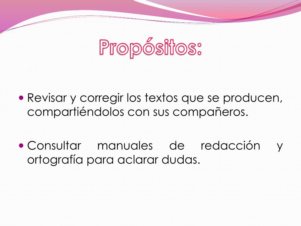 Propósitos: • Revisar y corregir los textos que se producen, compartiéndolos con sus compañeros. • Consultar manuales de redacción y ortografía para aclarar dudas.