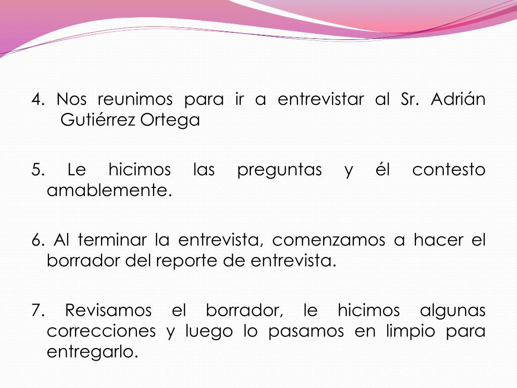 4. Nos reunimos para ir a entrevistar al Sr. Adrián Gutiérrez Ortega 5. Le hicimos las preguntas y él contesto amablemente. 6. Al terminar la entrevista, comenzamos a hacer el borrador del reporte de entrevista. 7. Revisamos el borrador, le hicimos algunas correcciones y luego lo pasamos en limpio para entregarlo.