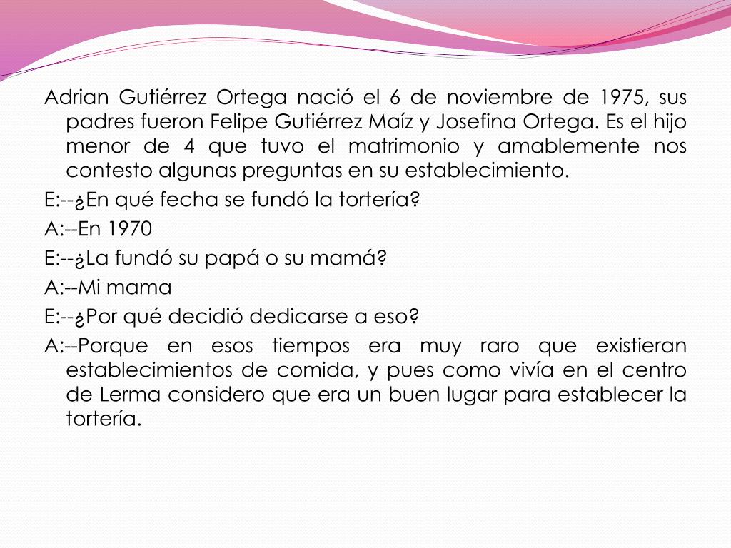 Adrian Gutiérrez Ortega nació el 6 de noviembre de 1975, sus padres fueron Felipe Gutiérrez Maíz y Josefina Ortega. Es el hijo menor de 4 que tuvo el matrimonio y amablemente nos contesto algunas preguntas en su establecimiento. E:--¿En qué fecha se fundó la tortería? A:--En 1970 E:--¿La fundó su papá o su mamá? A:--Mi mama E:--¿Por qué decidió dedicarse a eso? A:--Porque en esos tiempos era muy raro que existieran establecimientos de comida, y pues como vivía en el centro de Lerma considero que era un buen lugar para establecer la tortería.