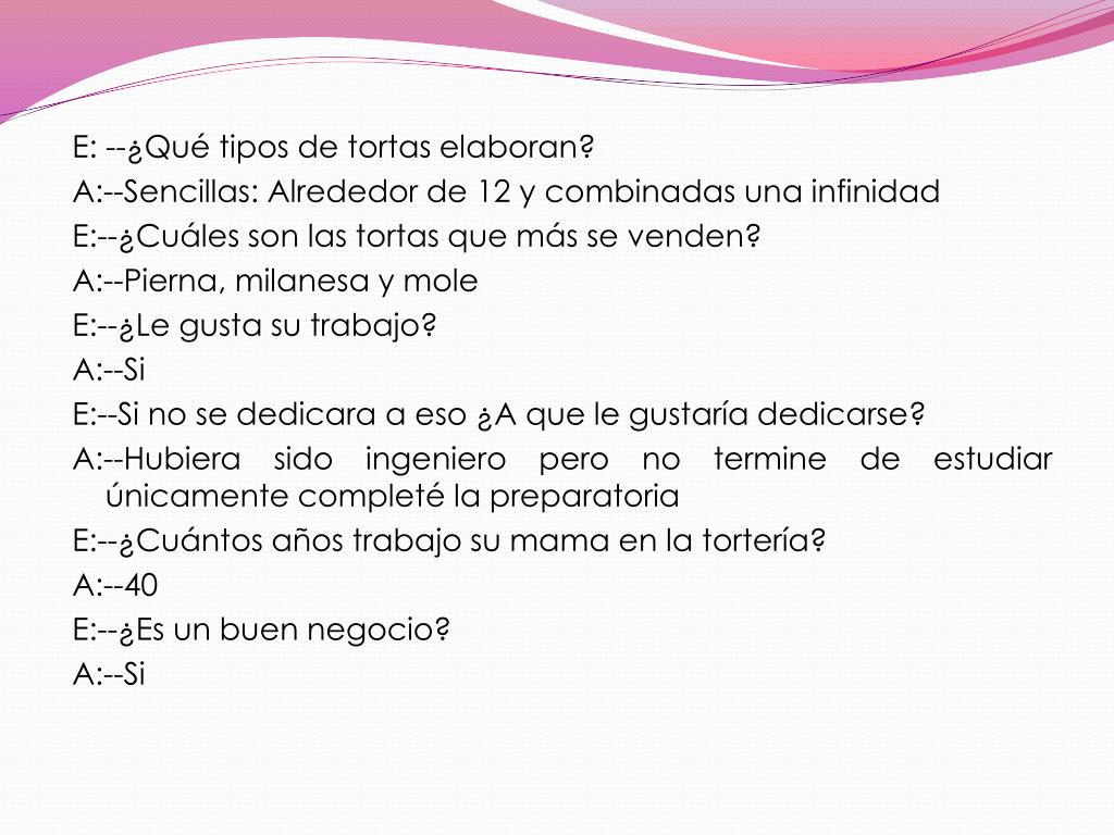 E: --¿Qué tipos de tortas elaboran? A:--Sencillas: Alrededor de 12 y combinadas una infinidad E:--¿Cuáles son las tortas que más se venden? A:--Pierna, milanesa y mole E:--¿Le gusta su trabajo? A:--Si E:--Si no se dedicara a eso ¿A que le gustaría dedicarse? A:--Hubiera sido ingeniero pero no termine de estudiar únicamente completé la preparatoria E:--¿Cuántos años trabajo su mama en la tortería? A:--40 E:--¿Es un buen negocio? A:--Si