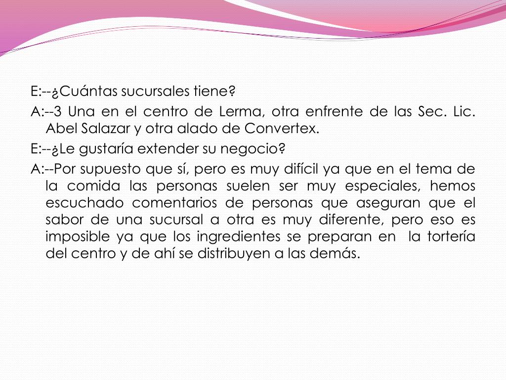 E:--¿Cuántas sucursales tiene? A:--3 Una en el centro de Lerma, otra enfrente de las Sec. Lic. Abel Salazar y otra alado de Convertex. E:--¿Le gustaría extender su negocio? A:--Por supuesto que sí, pero es muy difícil ya que en el tema de la comida las personas suelen ser muy especiales, hemos escuchado comentarios de personas que aseguran que el sabor de una sucursal a otra es muy diferente, pero eso es imposible ya que los ingredientes se preparan en la tortería del centro y de ahí se distribuyen a las demás.