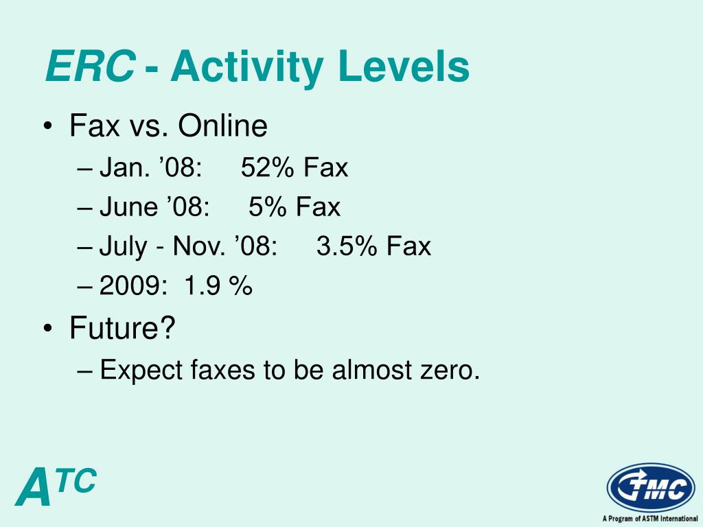 ERC - Activity Levels • Fax vs. Online • Jan. ’08: 52% Fax • June ’08: 5% Fax • July - Nov. ’08: 3.5% Fax • 2009: 1.9 % • Future? • Expect faxes to be almost zero.