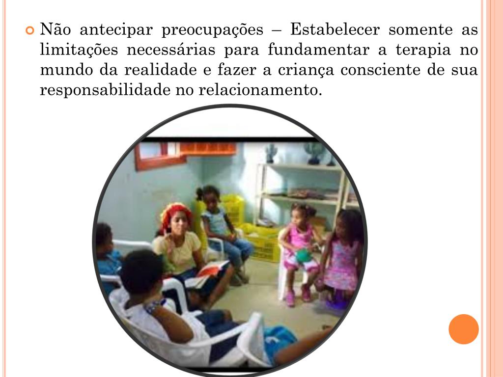 Não antecipar preocupações – Estabelecer somente as limitações necessárias para fundamentar a terapia no mundo da realidade e fazer a criança consciente de sua responsabilidade no relacionamento.
