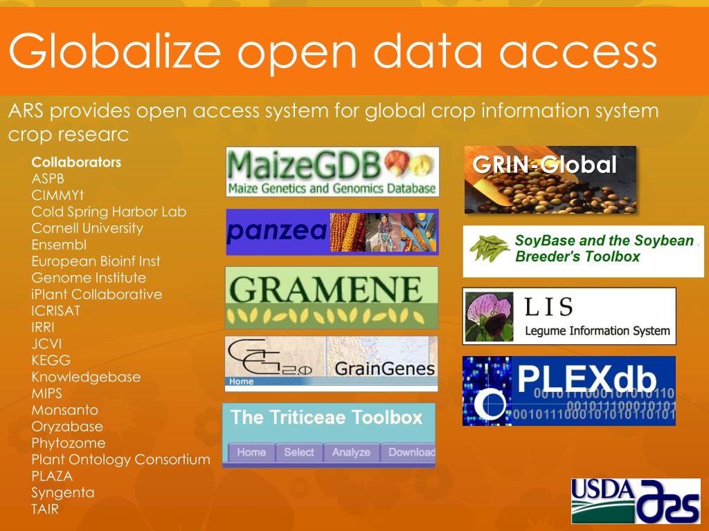 Globalize open data access ARS provides open access system for global crop information system crop researc GRIN-Global Collaborators ASPB CIMMYt Cold Spring Harbor Lab Cornell University Ensembl European Bioinf Inst Genome Institute iPlant Collaborative ICRISAT IRRI JCVI KEGG Knowledgebase MIPS Monsanto Oryzabase Phytozome Plant Ontology Consortium PLAZA Syngenta TAIR panzea