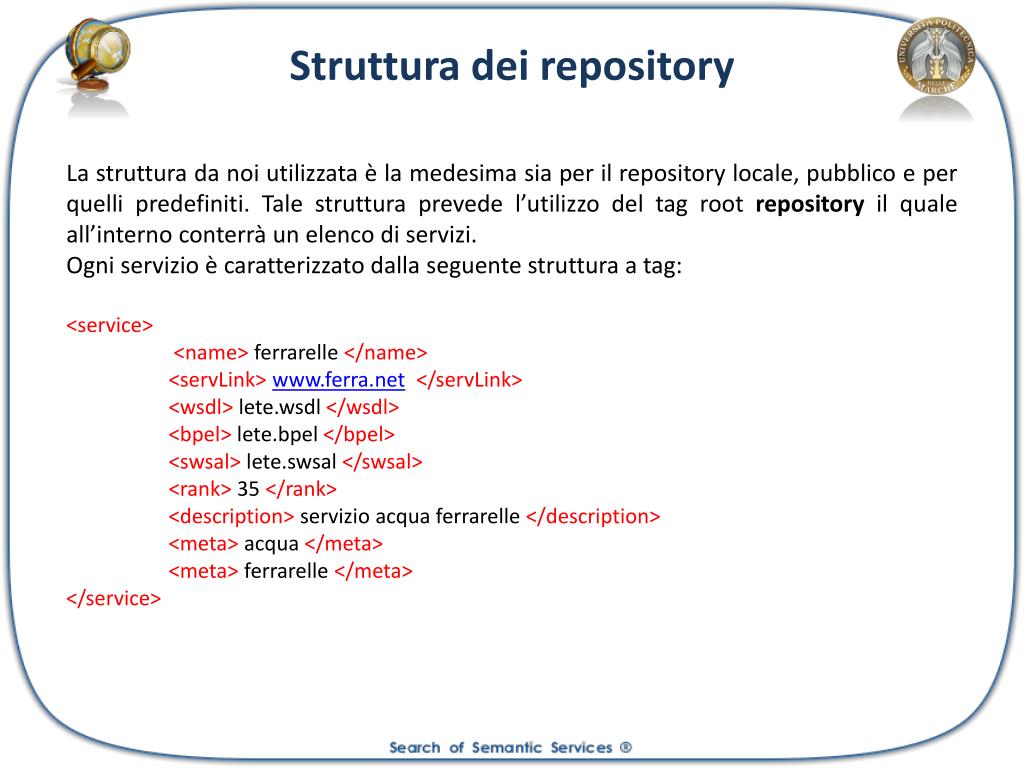 Struttura dei repository La struttura da noi utilizzata è la medesima sia per il repository locale, pubblico e per quelli predefiniti. Tale struttura prevede l’utilizzo del tagrootrepository il quale all’interno conterrà un elenco di servizi. Ogni servizio è caratterizzato dalla seguente struttura a tag: <service> <name> ferrarelle</name> <servLink> www.ferra.net </servLink> <wsdl> lete.wsdl </wsdl> <bpel> lete.bpel </bpel> <swsal> lete.swsal </swsal> <rank> 35 </rank> <description> servizio acqua ferrarelle</description> <meta> acqua </meta> <meta> ferrarelle </meta> </service>