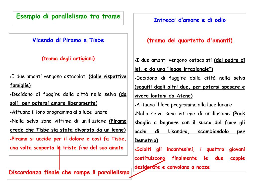 Esempio di parallelismo tra trame • Intrecci d’amore e di odio • (trama del quartetto d'amanti) • I due amanti vengono ostacolati (dal padre di lei, e da una "legge irrazionale") • Decidono di fuggire dalla città nella selva (seguiti dagli altri due, per potersi sposare e vivere lontani da Atene) • Attuano il loro programma alla luce lunare • Nella selva sono vittime di un’illusione (Puck sbaglia a bagnare con il succo del fiore gli occhi di Lisandro, scambiandolo per Demetrio) • Sciolti gli incantesimi, i quattro giovani costituiscono finalmente le due coppie desiderate e convolano a nozze • Vicenda di Piramo e Tisbe • (trama degli artigiani) • I due amanti vengono ostacolati (dalle rispettive famiglie) • Decidono di fuggire dalla città nella selva (da soli, per potersi amare liberamente) • Attuano il loro programma alla luce lunare • Nella selva sono vittime di un’illusione (Piramo crede che Tisbe sia stata divorata da un leone) • Piramo si uccide per il dolore e così fa Tisbe, una volta scoperta la triste fine del suo amato Discordanza finale che rompe il parallelismo
