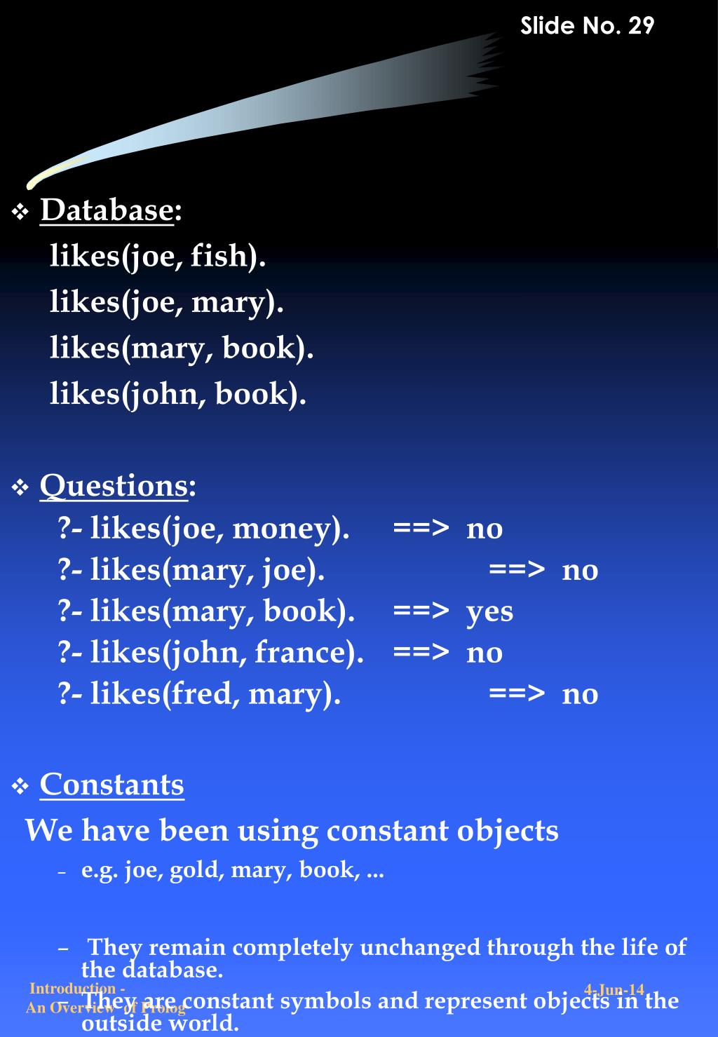 Database: likes(joe, fish). likes(joe, mary). likes(mary, book). likes(john, book). • Questions: ?- likes(joe, money). ==> no ?- likes(mary, joe). ==> no ?- likes(mary, book). ==> yes ?- likes(john, france). ==> no ?- likes(fred, mary). ==> no • Constants We have been using constant objects • e.g. joe, gold, mary, book, ... • They remain completely unchanged through the life of the database. • They are constant symbols and represent objects in the outside world.