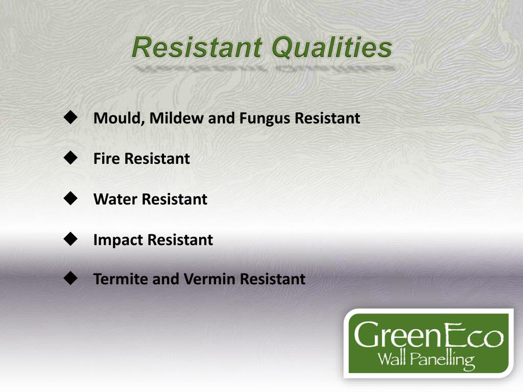 Resistant Qualities • Mould, Mildew and Fungus Resistant • Fire Resistant • Water Resistant • Impact Resistant • Termite and Vermin Resistant
