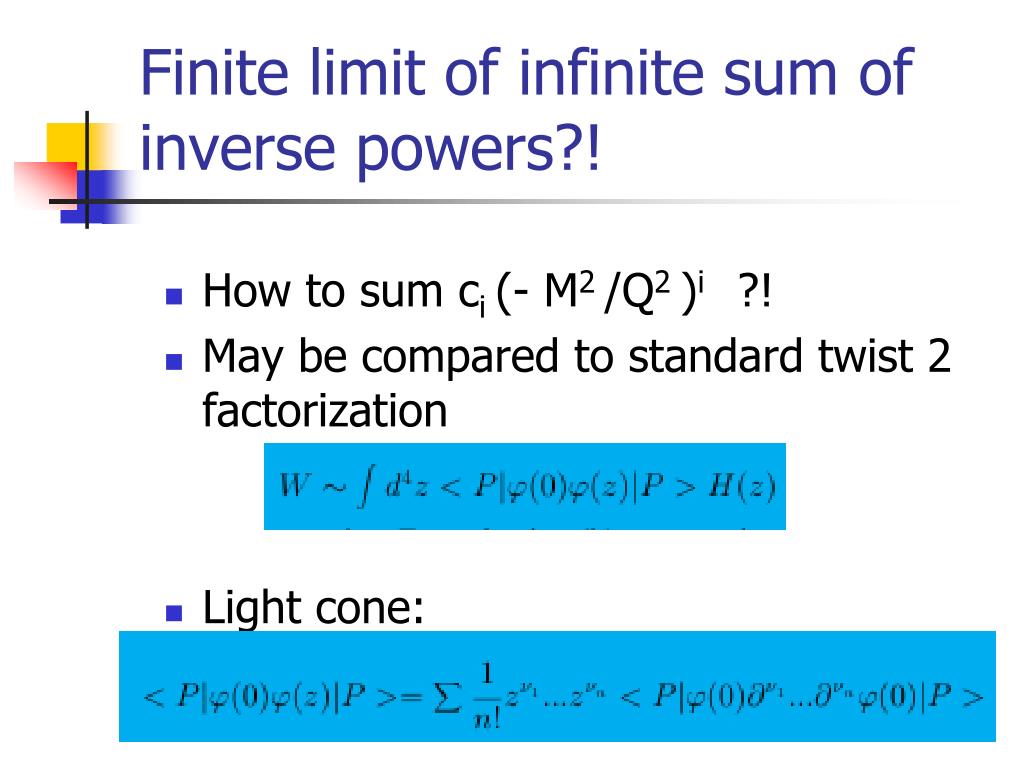 Finite limit of infinite sum of inverse powers?! • How to sum ci (- M2/Q2 )i ?! • May be compared to standard twist 2 factorization • Light cone: