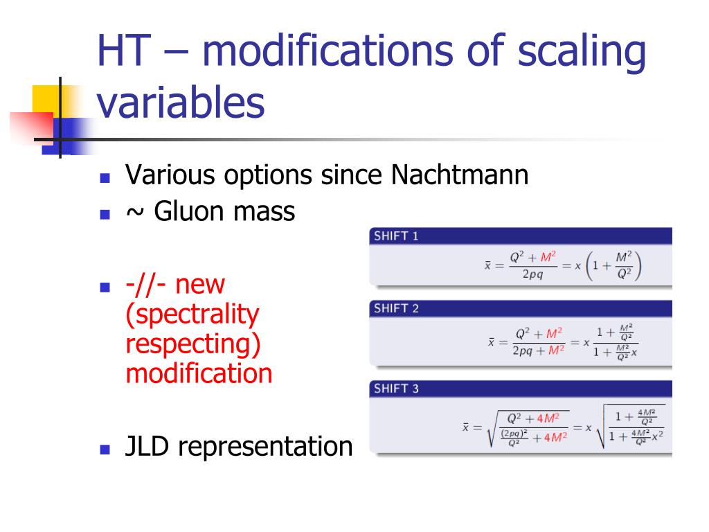 HT – modifications of scaling variables • Various options since Nachtmann • ~ Gluon mass • -//- new (spectrality respecting) modification • JLD representation