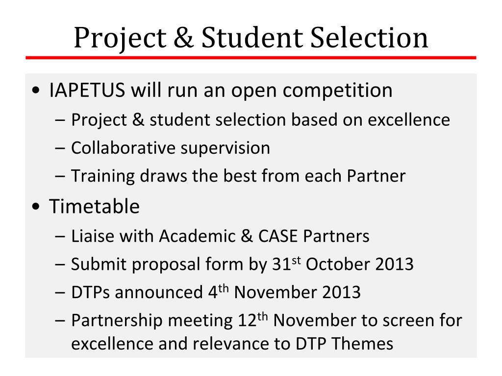 Project & Student Selection • IAPETUS will run an open competition • Project & student selection based on excellence • Collaborative supervision • Training draws the best from each Partner • Timetable • Liaise with Academic & CASE Partners • Submit proposal form by 31st October 2013 • DTPs announced 4th November 2013 • Partnership meeting 12th November to screen for excellence and relevance to DTP Themes