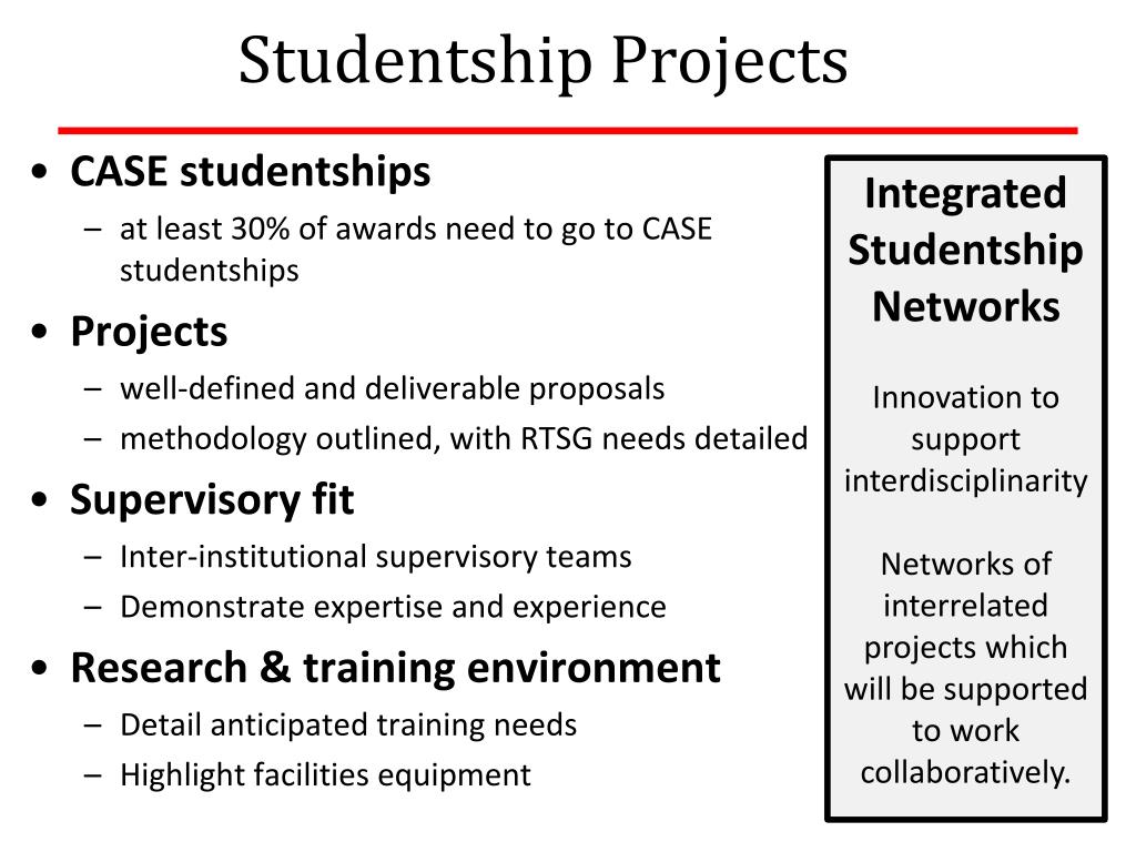 Studentship Projects Integrated Studentship Networks Innovation to support interdisciplinarity Networks of interrelated projects which will be supported to work collaboratively. • CASE studentships • at least 30% of awards need to go to CASE studentships • Projects • well-defined and deliverable proposals • methodology outlined, with RTSG needs detailed • Supervisory fit • Inter-institutional supervisory teams • Demonstrate expertise and experience • Research & training environment • Detail anticipated training needs • Highlight facilities equipment