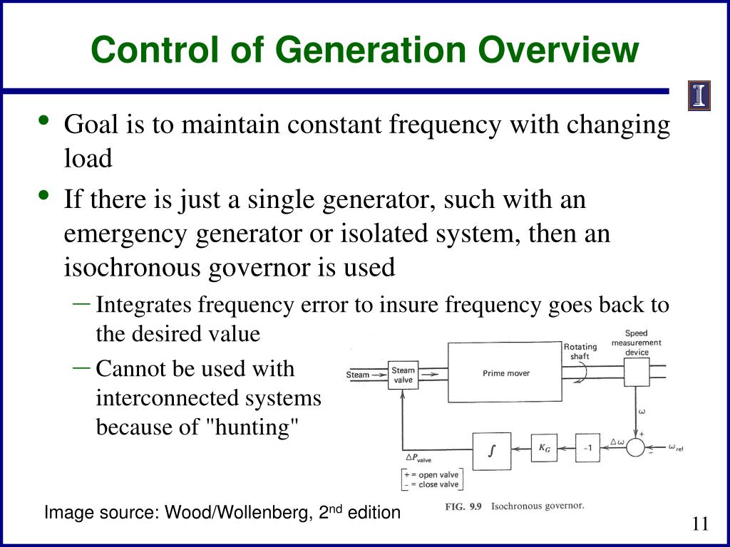 Control of Generation Overview • Goal is to maintain constant frequency with changing load • If there is just a single generator, such with an emergency generator or isolated system, then an isochronous governor is used • Integrates frequency error to insure frequency goes back tothe desired value • Cannot be used withinterconnected systemsbecause of "hunting" Image source: Wood/Wollenberg, 2nd edition