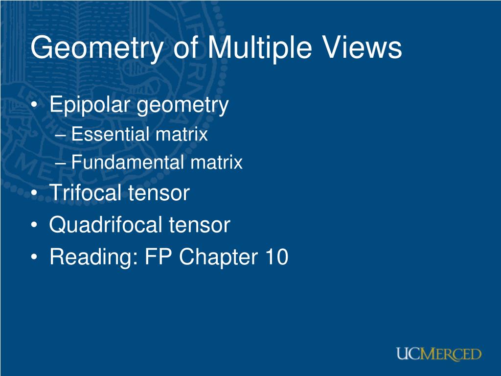 Geometry of Multiple Views • Epipolar geometry • Essential matrix • Fundamental matrix • Trifocal tensor • Quadrifocal tensor • Reading: FP Chapter 10