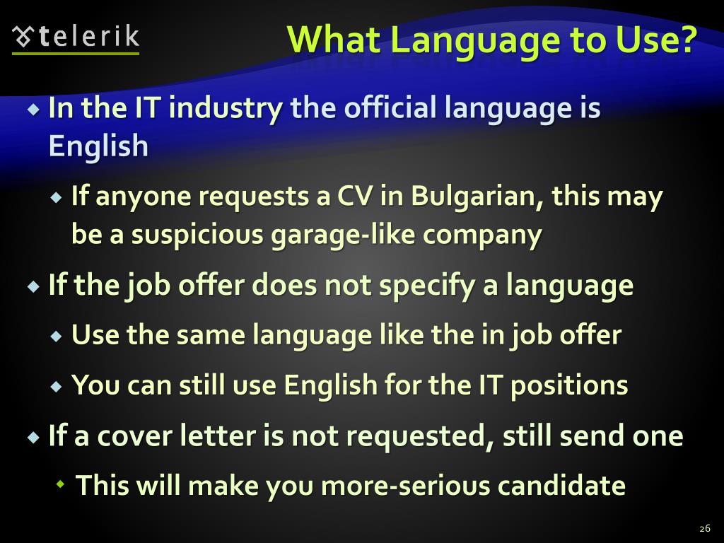 What Language to Use? • In the IT industry the official language is English • If anyone requests a CV in Bulgarian, this may be a suspicious garage-like company • If the job offer does not specify a language • Use the same language like the in job offer • You can still use English for the IT positions • If a cover letter is not requested, still send one • This will make you more-serious candidate