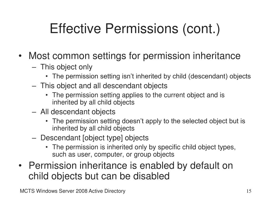 Effective Permissions Effective permissions for an object are a combination of the allowed and denied permissions assigned to a security principal Can come from assignments made directly to a single user account or to a group the user belongs to Explicit permissions override inherited permissions and can create some exceptions to the rule that Deny permissions override Allow permissions MCTS Windows Server 2008 Active Directory