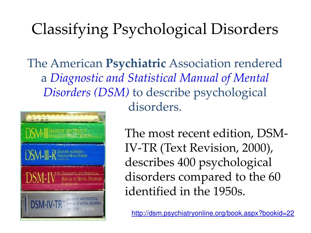 Classifying Psychological Disorders The American Psychiatric Association rendered a Diagnostic and Statistical Manual of Mental Disorders (DSM) to describe psychological disorders. The most recent edition, DSM-IV-TR (Text Revision, 2000), describes 400 psychological disorders compared to the 60 identified in the 1950s. http://dsm.psychiatryonline.org/book.aspx?bookid=22