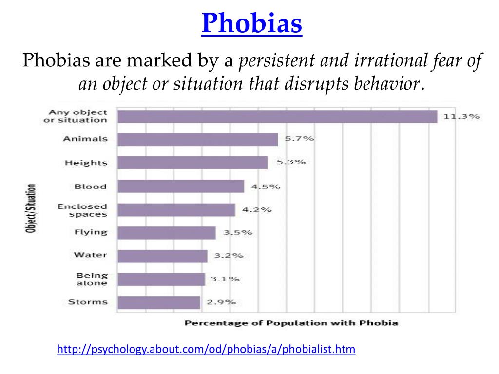 Phobias Phobias are marked by a persistent and irrational fearof an object or situation that disrupts behavior. Agoraphobia – fear of open places (only phobia listed in the DSM) http://psychology.about.com/od/phobias/a/phobialist.htm