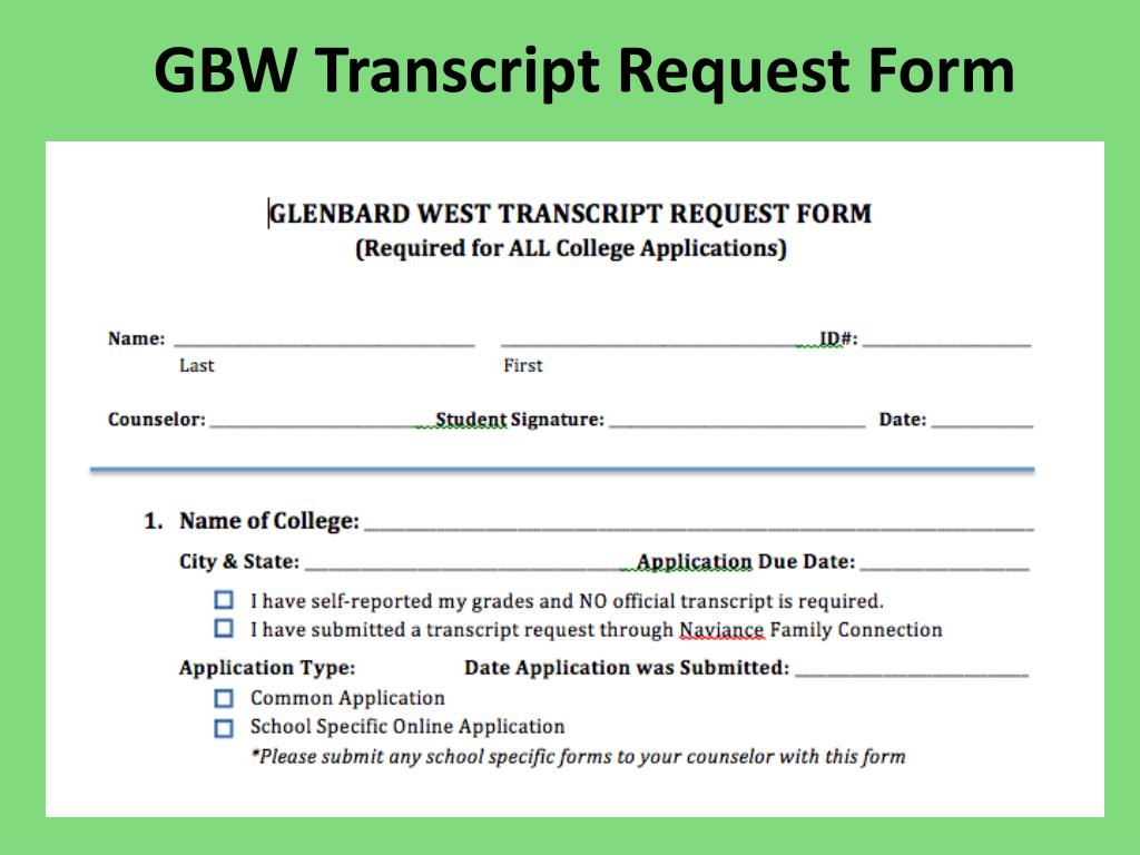 What to do when an application is complete: • Log applications into Naviance Family Connection under “colleges I’m applying to” • Request transcripts to be sent to colleges (allow at least two weeksfor processing) • Complete paper copy of the GBW Transcript Request Form and turn into your counselor • Follow up to be sure all the materials have been received by the college