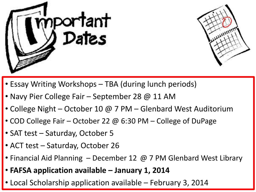 Essay Writing Workshops – TBA (during lunch periods) • Navy Pier College Fair – September 28 @ 11 AM • College Night – October 10 @ 7 PM – Glenbard West Auditorium • COD College Fair – October 22 @ 6:30 PM – College of DuPage • SAT test – Saturday, October 5 • ACT test – Saturday, October 26 • Financial Aid Planning – December 12 @ 7 PM Glenbard West Library • FAFSA application available – January 1, 2014 • Local Scholarship application available – February 3, 2014