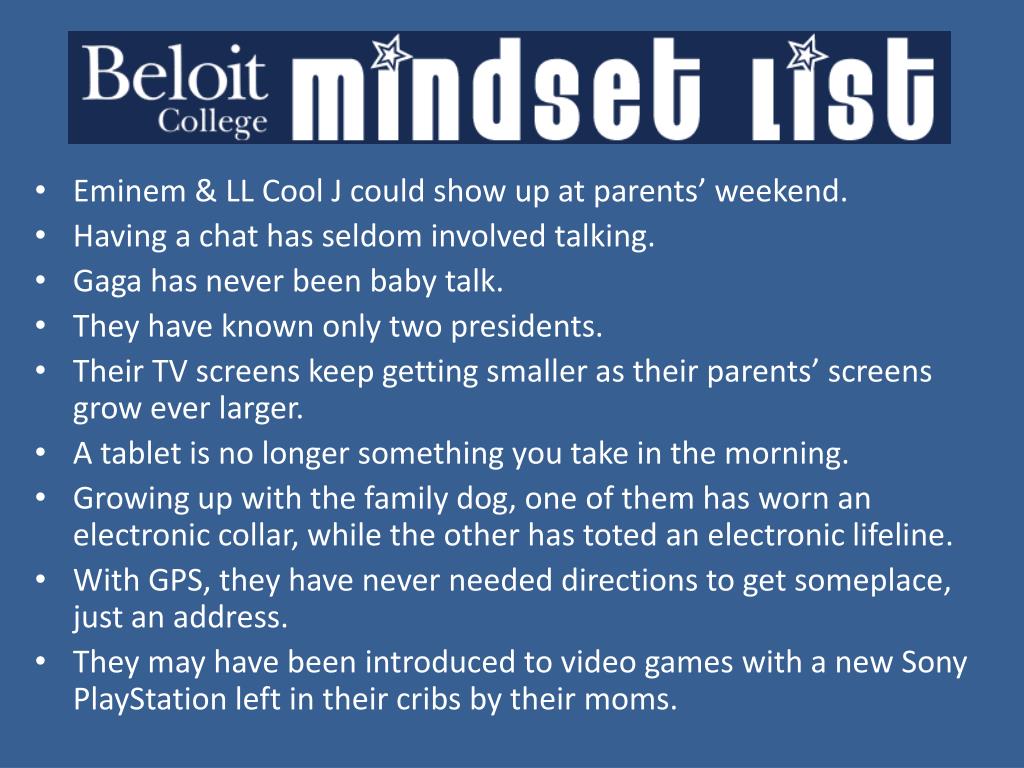 Eminem & LL Cool J could show up at parents’ weekend. • Having a chat has seldom involved talking. • Gaga has never been baby talk. • They have known only two presidents. • Their TV screens keep getting smaller as their parents’ screens grow ever larger. • A tablet is no longer something you take in the morning. • Growing up with the family dog, one of them has worn an electronic collar, while the other has toted an electronic lifeline. • With GPS, they have never needed directions to get someplace, just an address. • They may have been introduced to video games with a new Sony PlayStation left in their cribs by their moms.