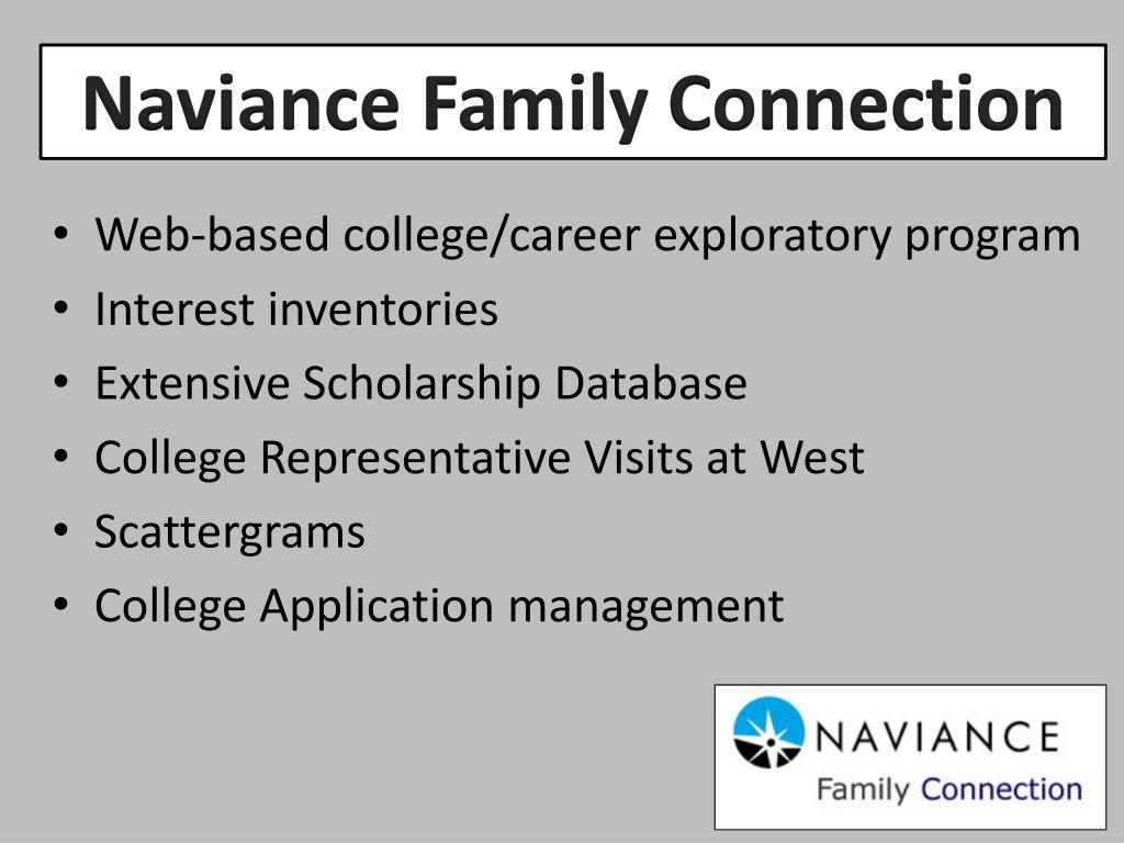 Naviance Family Connection • Web-based college/career exploratory program • Interest inventories • Extensive Scholarship Database • College Representative Visits at West • Scattergrams • College Application management