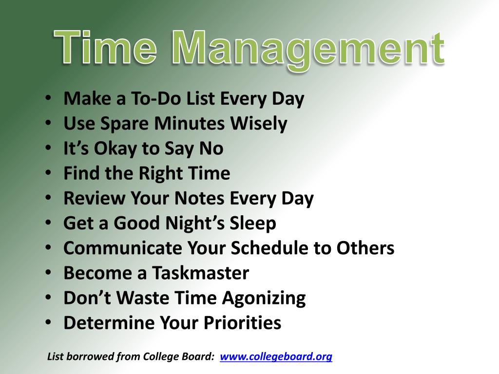 Time Management • Make a To-Do List Every Day • Use Spare Minutes Wisely • It’s Okay to Say No • Find the Right Time • Review Your Notes Every Day • Get a Good Night’s Sleep • Communicate Your Schedule to Others • Become a Taskmaster • Don’t Waste Time Agonizing • Determine Your Priorities List borrowed from College Board: www.collegeboard.org