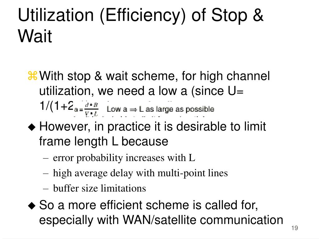 Utilization (Efficiency) of Stop & Wait • With stop & wait scheme, for high channel utilization, we need a low a (since U= 1/(1+2a)) • However, in practice it is desirable to limit frame length L because • error probability increases with L • high average delay with multi-point lines • buffer size limitations • So a more efficient scheme is called for, especially with WAN/satellite communication