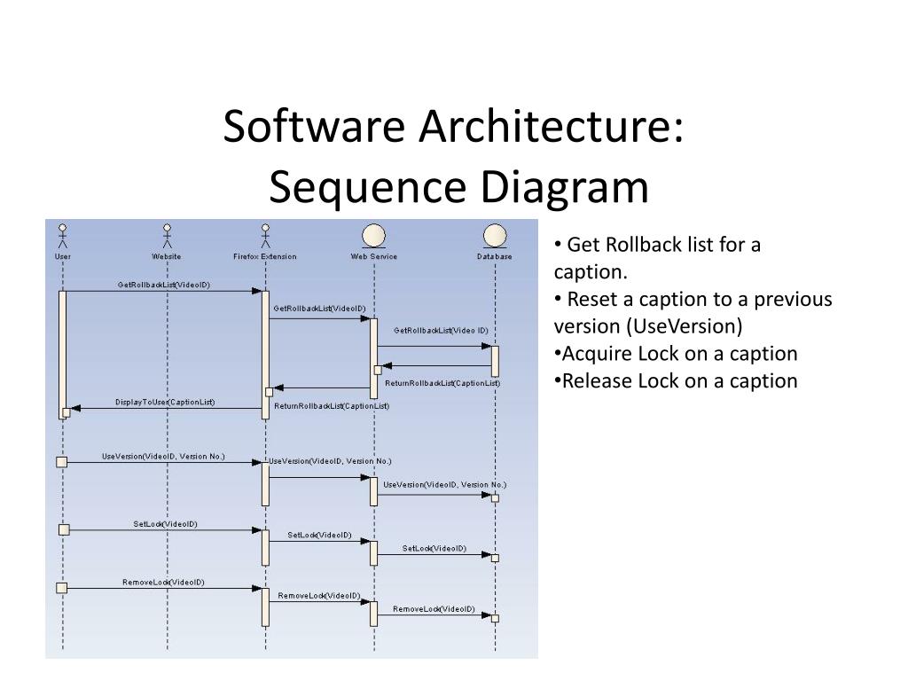 Software Architecture: Sequence Diagram • Get Rollback list for a caption. • Reset a caption to a previous version (UseVersion) • Acquire Lock on a caption • Release Lock on a caption
