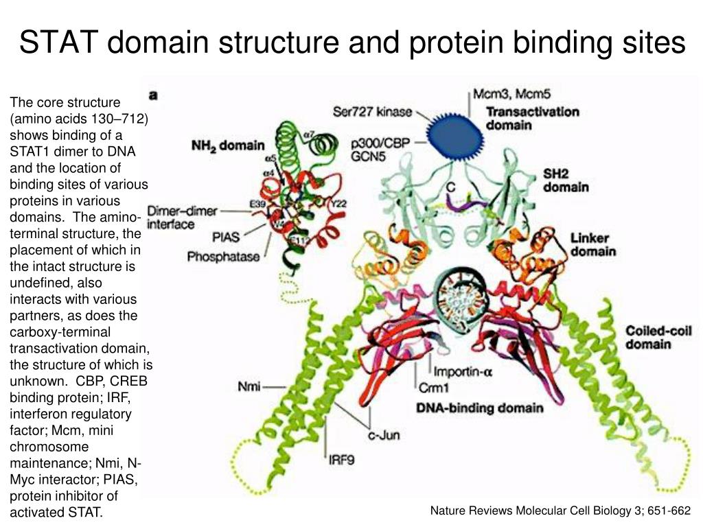 STAT domain structure and protein binding sites The core structure (amino acids 130–712) shows binding of a STAT1 dimer to DNA and the location of binding sites of various proteins in various domains. The amino-terminal structure, the placement of which in the intact structure is undefined, also interacts with various partners, as does the carboxy-terminal transactivation domain, the structure of which is unknown. CBP, CREB binding protein; IRF, interferon regulatory factor; Mcm, mini chromosome maintenance; Nmi, N-Mycinteractor; PIAS, protein inhibitor of activated STAT. Nature Reviews Molecular Cell Biology 3; 651-662