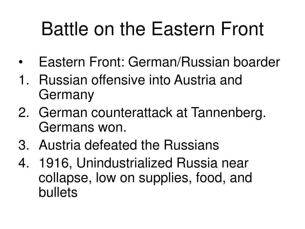Battle on the Eastern Front • Eastern Front: German/Russian boarder • Russian offensive into Austria and Germany • German counterattack at Tannenberg. Germans won. • Austria defeated the Russians • 1916, Unindustrialized Russia near collapse, low on supplies, food, and bullets
