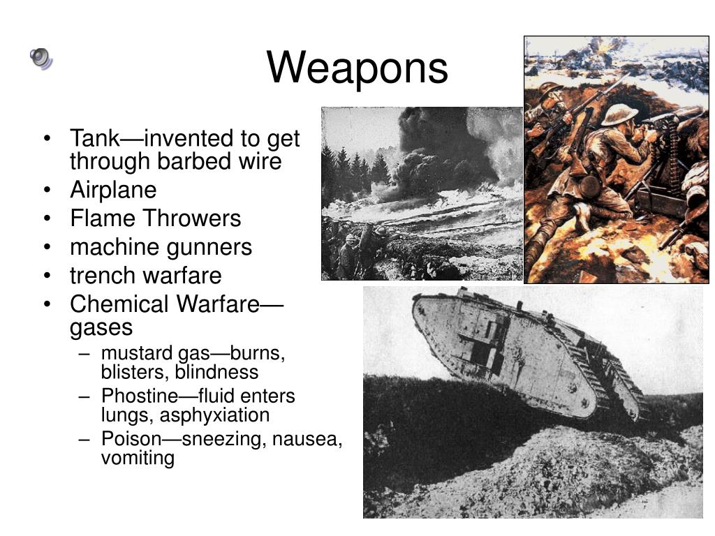 Weapons • Tank—invented to get through barbed wire • Airplane • Flame Throwers • machine gunners • trench warfare • Chemical Warfare—gases • mustard gas—burns, blisters, blindness • Phostine—fluid enters lungs, asphyxiation • Poison—sneezing, nausea, vomiting