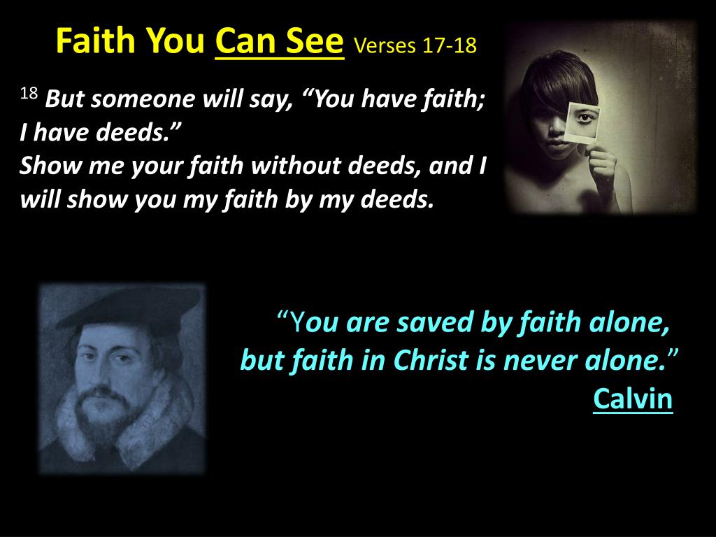 Faith You Can SeeVerses 17-18 • 18But someone will say, “You have faith; • I have deeds.” • Show me your faith without deeds, and I • will show you my faith by my deeds. • “You are saved by faith alone, but faith in Christ is never alone.” • Calvin