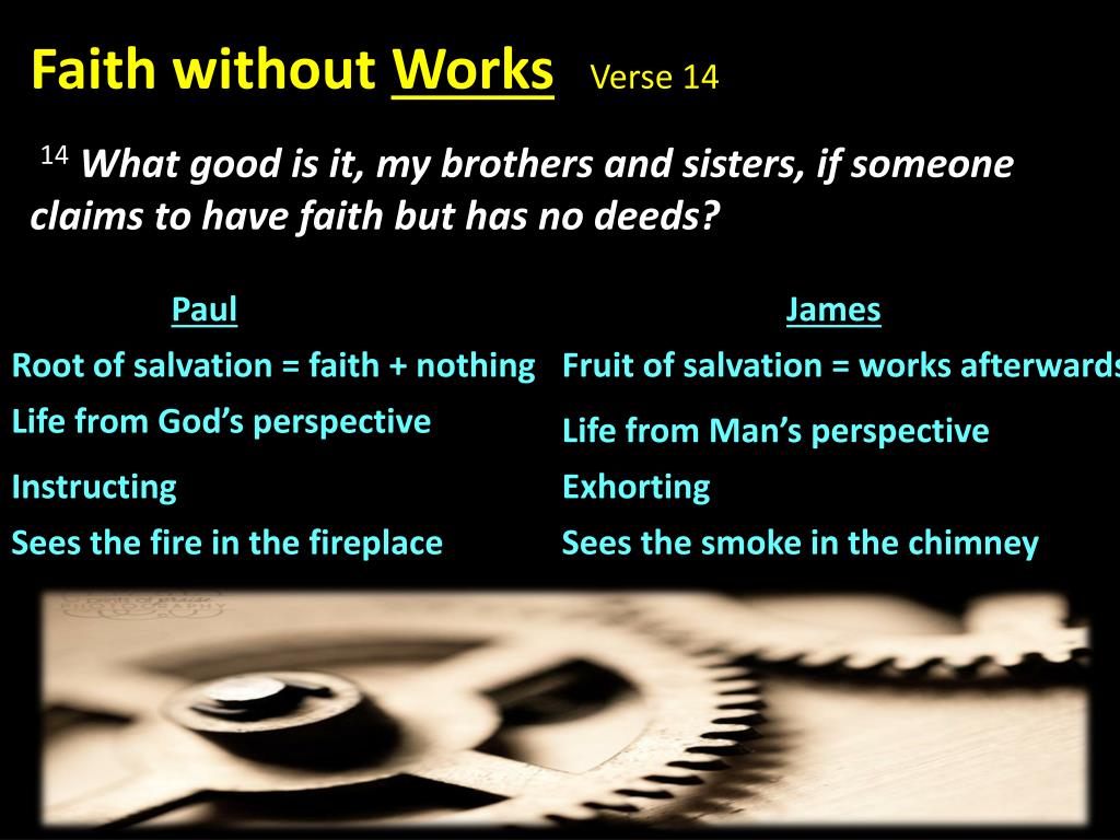 Faith without WorksVerse 14 • 14What good is it, my brothers and sisters, if someone claims to have faith but has no deeds? Paul James Root of salvation = faith + nothing Fruit of salvation = works afterwards Life from God’s perspective Life from Man’s perspective Instructing Exhorting Sees the fire in the fireplace Sees the smoke in the chimney