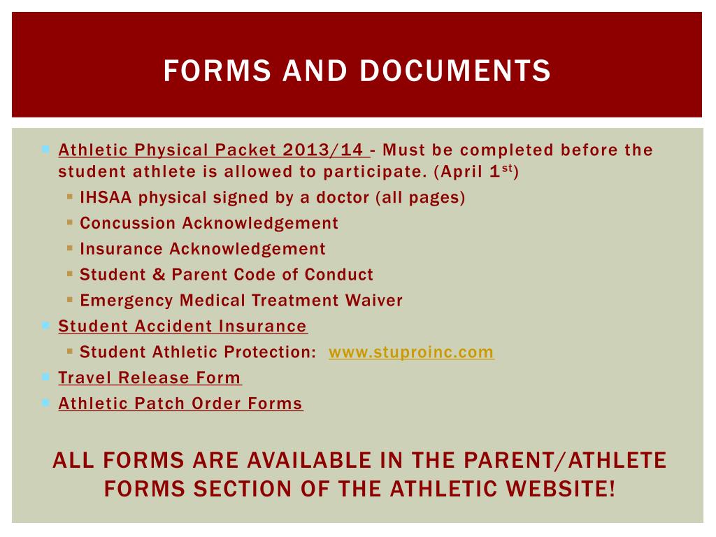 Forms and documents • Athletic Physical Packet 2013/14 - Must be completed before the student athlete is allowed to participate. (April 1st) • IHSAA physical signed by a doctor (all pages) • Concussion Acknowledgement • Insurance Acknowledgement • Student & Parent Code of Conduct • Emergency Medical Treatment Waiver • Student Accident Insurance • Student Athletic Protection: www.stuproinc.com • Travel Release Form • Athletic Patch Order Forms ALL FORMS ARE AVAILABLE IN THE PARENT/ATHLETE FORMS SECTION OF THE ATHLETIC WEBSITE!