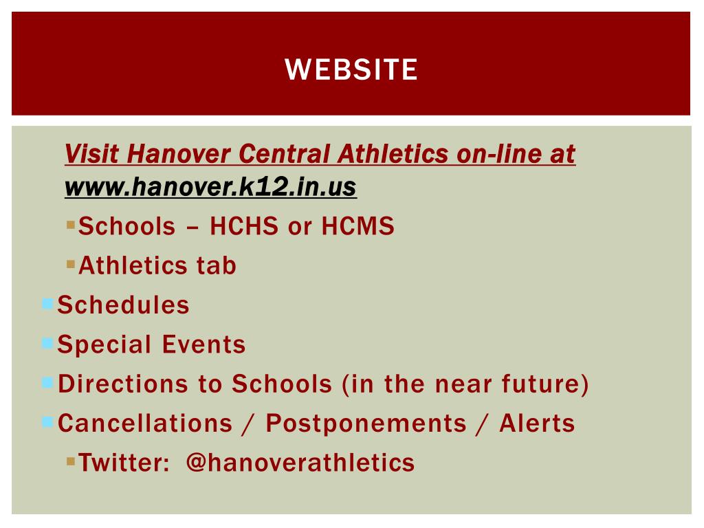website Visit Hanover Central Athletics on-line at www.hanover.k12.in.us • Schools – HCHS or HCMS • Athletics tab • Schedules • Special Events • Directions to Schools (in the near future) • Cancellations / Postponements / Alerts • Twitter: @hanoverathletics