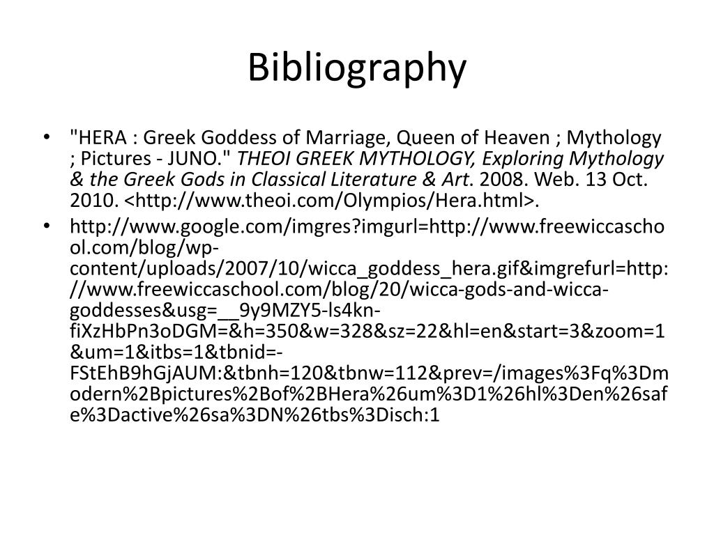 Bibliography • "HERA : Greek Goddess of Marriage, Queen of Heaven ; Mythology ; Pictures - JUNO." THEOI GREEK MYTHOLOGY, Exploring Mythology & the Greek Gods in Classical Literature & Art. 2008. Web. 13 Oct. 2010. <http://www.theoi.com/Olympios/Hera.html>. • http://www.google.com/imgres?imgurl=http://www.freewiccaschool.com/blog/wp-content/uploads/2007/10/wicca_goddess_hera.gif&imgrefurl=http://www.freewiccaschool.com/blog/20/wicca-gods-and-wicca-goddesses&usg=__9y9MZY5-ls4kn-fiXzHbPn3oDGM=&h=350&w=328&sz=22&hl=en&start=3&zoom=1&um=1&itbs=1&tbnid=-FStEhB9hGjAUM:&tbnh=120&tbnw=112&prev=/images%3Fq%3Dmodern%2Bpictures%2Bof%2BHera%26um%3D1%26hl%3Den%26safe%3Dactive%26sa%3DN%26tbs%3Disch:1