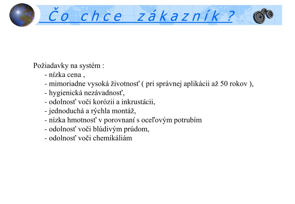 Č o c h c e z á k a z n í k ? Požiadavky na systém : - nízka cena , - mimoriadne vysoká životnosť ( pri správnej aplikácii až 50 rokov ), - hygienická nezávadnosť, - odolnosť voči korózii a inkrustácii, - jednoduchá a rýchla montáž, - nízka hmotnosť v porovnaní s oceľovým potrubím - odolnosť voči blúdivým prúdom, - odolnosť voči chemikáliám