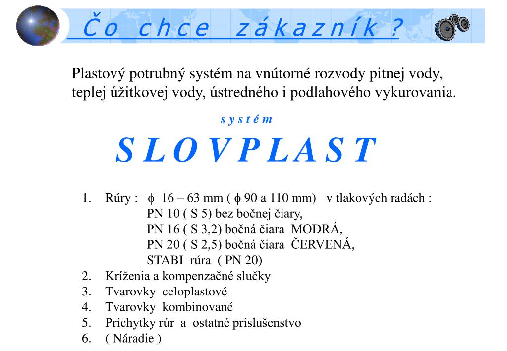 Č o c h c e z á k a z n í k ? Plastový potrubný systém na vnútorné rozvody pitnej vody, teplej úžitkovej vody, ústredného i podlahového vykurovania. s y s t é m S L O V P L A S T • Rúry : f 16 – 63 mm ( f 90 a 110 mm) v tlakových radách : • PN 10 ( S 5) bez bočnej čiary, • PN 16 ( S 3,2) bočná čiara MODRÁ, • PN 20 ( S 2,5) bočná čiara ČERVENÁ, • STABI rúra ( PN 20) • Kríženia a kompenzačné slučky • Tvarovky celoplastové • Tvarovky kombinované • Príchytky rúr a ostatné príslušenstvo • ( Náradie )