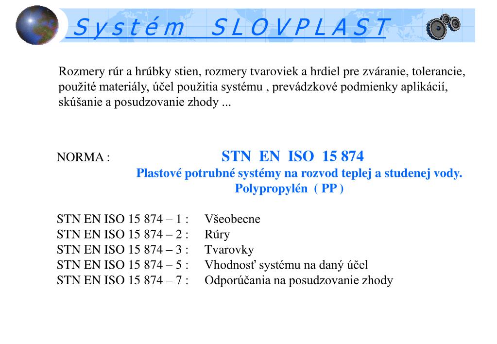 S y s t é m S L O V P L A S T Rozmery rúr a hrúbky stien, rozmery tvaroviek a hrdiel pre zváranie, tolerancie, použité materiály, účel použitia systému , prevádzkové podmienky aplikácií, skúšanie a posudzovanie zhody ... NORMA : STN EN ISO 15 874 Plastové potrubné systémy na rozvod teplej a studenej vody. Polypropylén ( PP ) STN EN ISO 15 874 – 1 : Všeobecne STN EN ISO 15 874 – 2 : Rúry STN EN ISO 15 874 – 3 : Tvarovky STN EN ISO 15 874 – 5 : Vhodnosť systému na daný účel STN EN ISO 15 874 – 7 : Odporúčania na posudzovanie zhody
