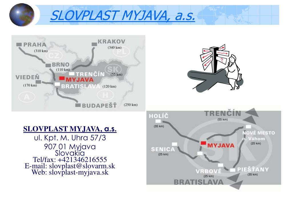 Predstavenie spoločnosti. SLOVPLAST MYJAVA, a.s. (340 km). (310 km). (110 km). (55 km). (170 km). (120 km). (250 km). (55 km). SLOVPLAST MYJAVA, a.s. ul . Kpt. M. Uhra 57/3 907 01 Myjava Slovakia Tel/fax: +421346216555 E-mail: slovplast @ slovarm.sk Web: slovplast-myjava.sk.