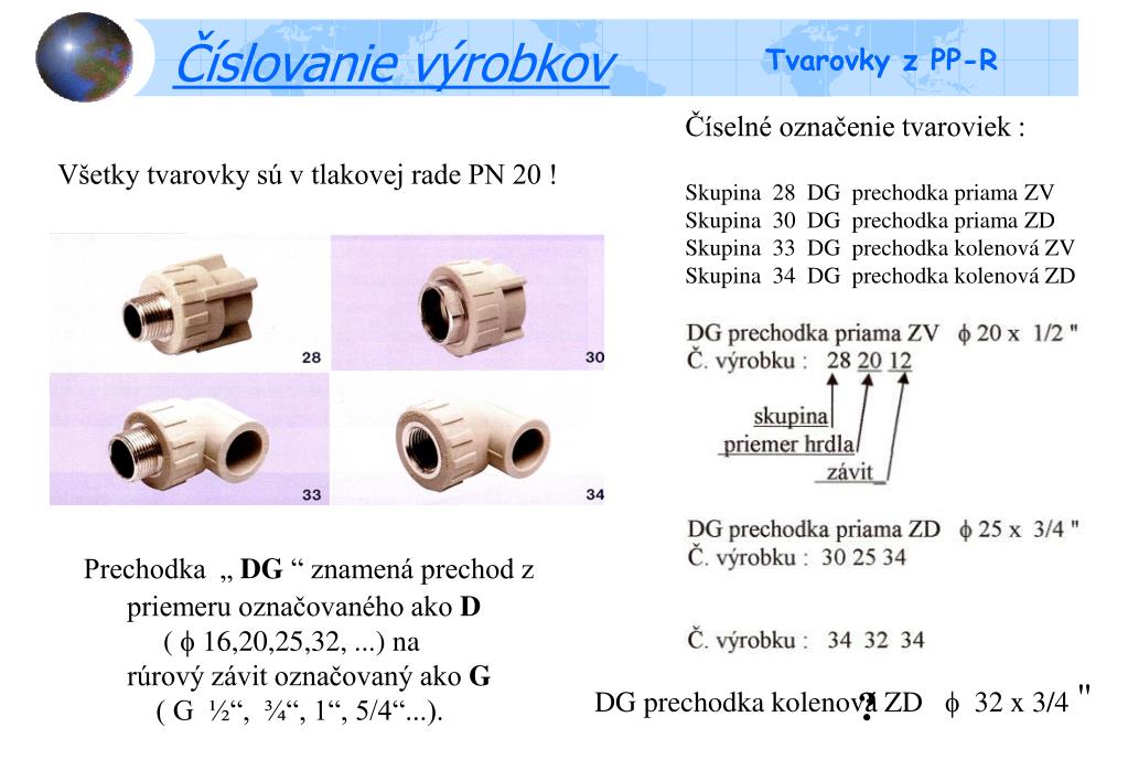 Číslovanie výrobkov Tvarovky z PP-R Číselné označenie tvaroviek : Skupina 28 DG prechodka priama ZV Skupina 30 DG prechodka priama ZD Skupina 33 DG prechodka kolenová ZV Skupina 34 DG prechodka kolenová ZD Všetky tvarovky sú v tlakovej rade PN 20 ! Prechodka „ DG “ znamená prechod z priemeru označovaného ako D ( f 16,20,25,32, ...) na rúrový závit označovaný ako G ( G ½“, ¾“, 1“, 5/4“...). DG prechodka kolenová ZD f 32 x 3/4 " ?