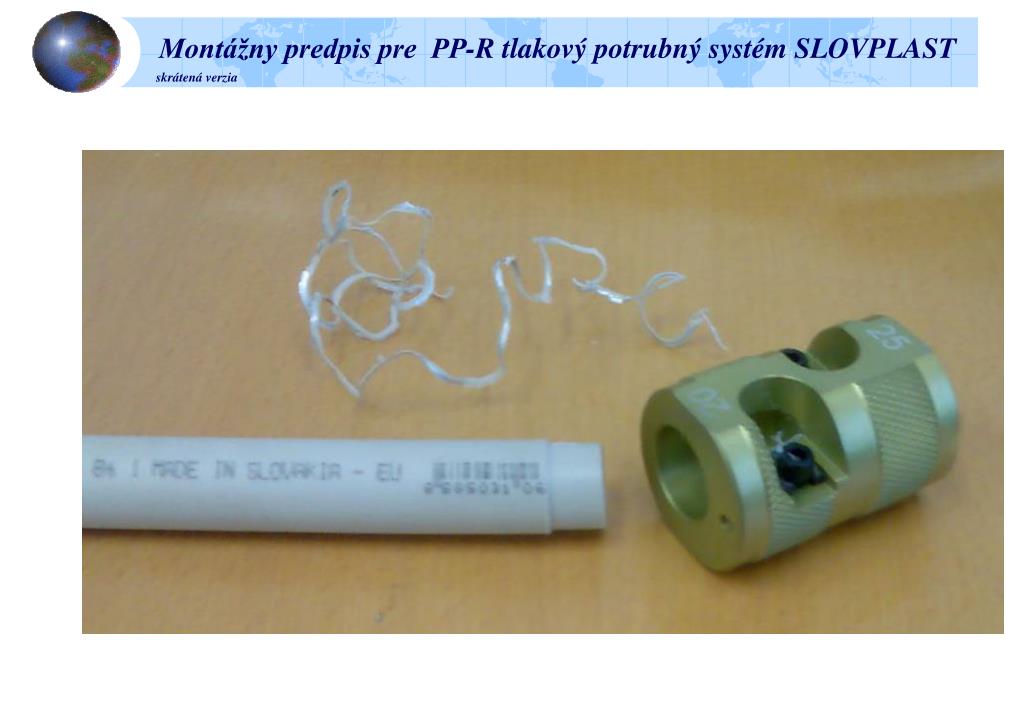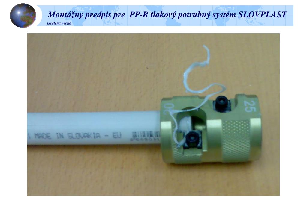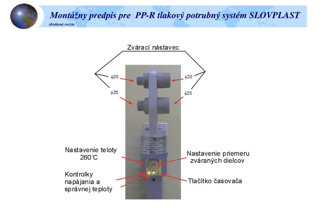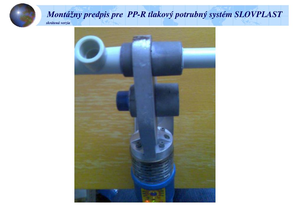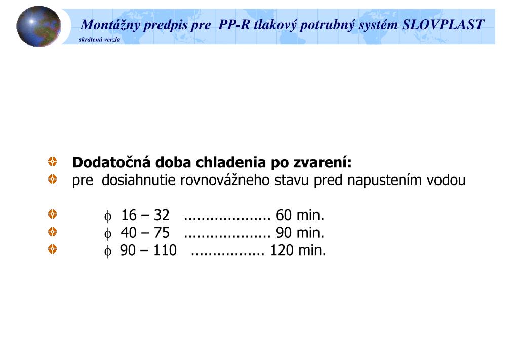 Montážny predpis pre PP-R tlakový potrubný systém SLOVPLAST skrátená verzia • Dodatočná doba chladenia po zvarení: • predosiahnutie rovnovážneho stavu pred napustením vodou • f 16 – 32 .................... 60 min. • f 40 – 75 .................... 90 min. • f 90 – 110 ................. 120 min.
