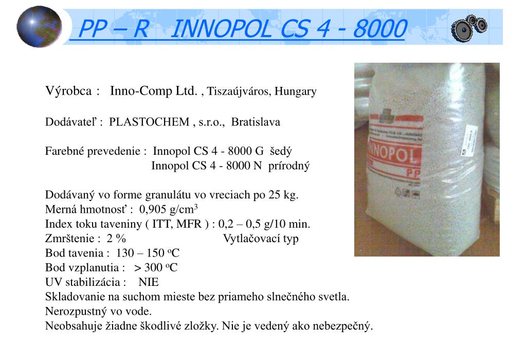 PP – R INNOPOL CS 4 - 8000 Výrobca: Inno-Comp Ltd. , Tiszaújváros, Hungary Dodávateľ : PLASTOCHEM , s.r.o., Bratislava Farebné prevedenie : Innopol CS 4 - 8000 G šedý Innopol CS 4 - 8000 N prírodný Dodávaný vo forme granulátu vo vreciach po 25 kg. Merná hmotnosť : 0,905 g/cm3 Index toku taveniny ( ITT, MFR ) : 0,2 – 0,5 g/10 min. Zmrštenie : 2 % Vytlačovací typ Bod tavenia : 130 – 150 oC Bod vzplanutia : > 300 oC UV stabilizácia : NIE Skladovanie na suchom mieste bez priameho slnečného svetla. Nerozpustný vo vode. Neobsahuje žiadne škodlivé zložky. Nie je vedený ako nebezpečný.