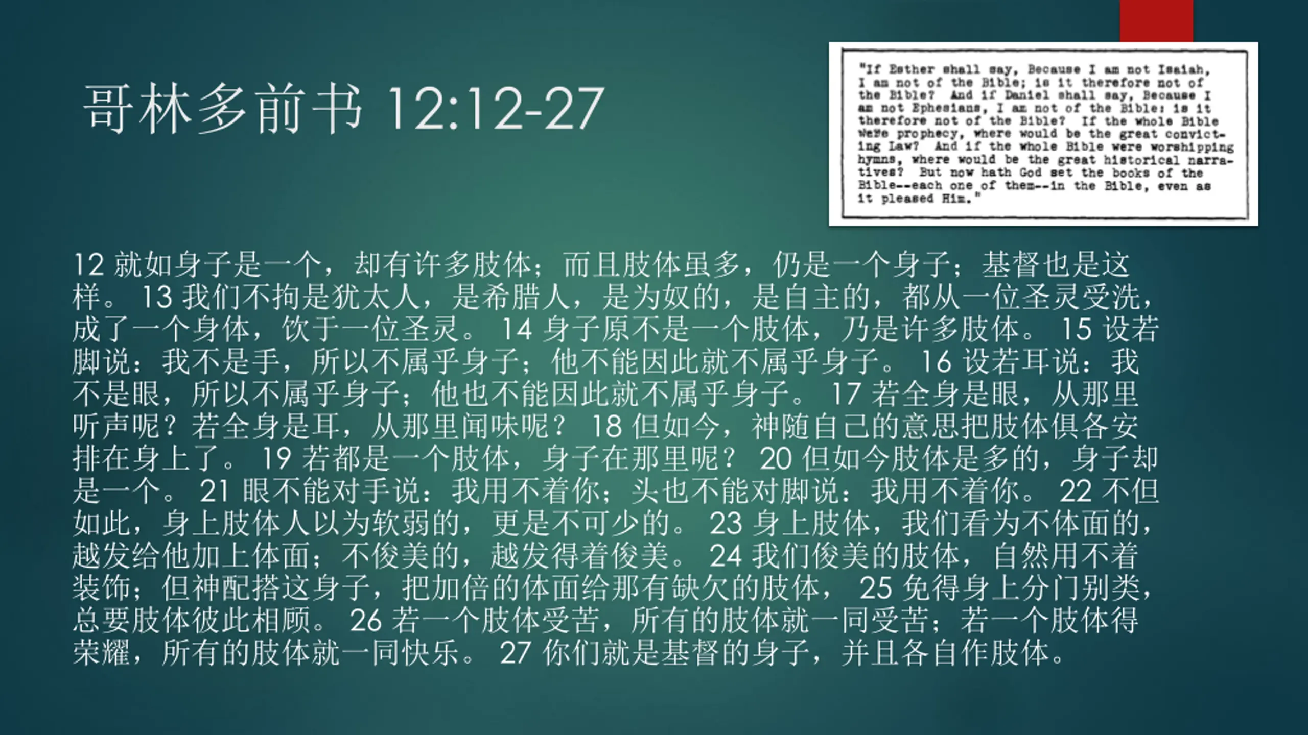 哥林多前书 12:12-27 12 就如身子是一个,却有许多肢体;而且肢体虽多,仍是一个身子;基督也是这 样。 13 我们不拘是犹太人,是希腊人,是为奴的,是自主的,都从一位圣灵受洗, 成了一个身体,饮于一位圣灵。 14 身子原不是一个肢体,乃是许多肢体。 15 设若 脚说:我不是手,所以不属乎身子;他不能因此就不属乎身子。 16 设若耳说:我 不是眼,所以不属乎身子;他也不能因此就不属乎身子。 17 若全身是眼,从那里 听声呢?若全身是耳,从那里闻味呢? 18 但如今,神随自己的意思把肢体俱各安 排在身上了。 19 若都是一个肢体,身子在那里呢? 20 但如今肢体是多的,身子却 是一个。 21 眼不能对手说:我用不着你;头也不能对脚说:我用不着你。 22 不但 如此,身上肢体人以为软弱的,更是不可少的。 23 身上肢体,我们看为不体面的, 越发给他加上体面;不俊美的,越发得着俊美。 24 我们俊美的肢体,自然用不着 装饰;但神配搭这身子,把加倍的体面给那有缺欠的肢体, 25 免得身上分门别类, 总要肢体彼此相顾。 26 若一个肢体受苦,所有的肢体就一同受苦;若一个肢体得 荣耀,所有的肢体就一同快乐。 27 你们就是基督的身子,并且各自作肢体。